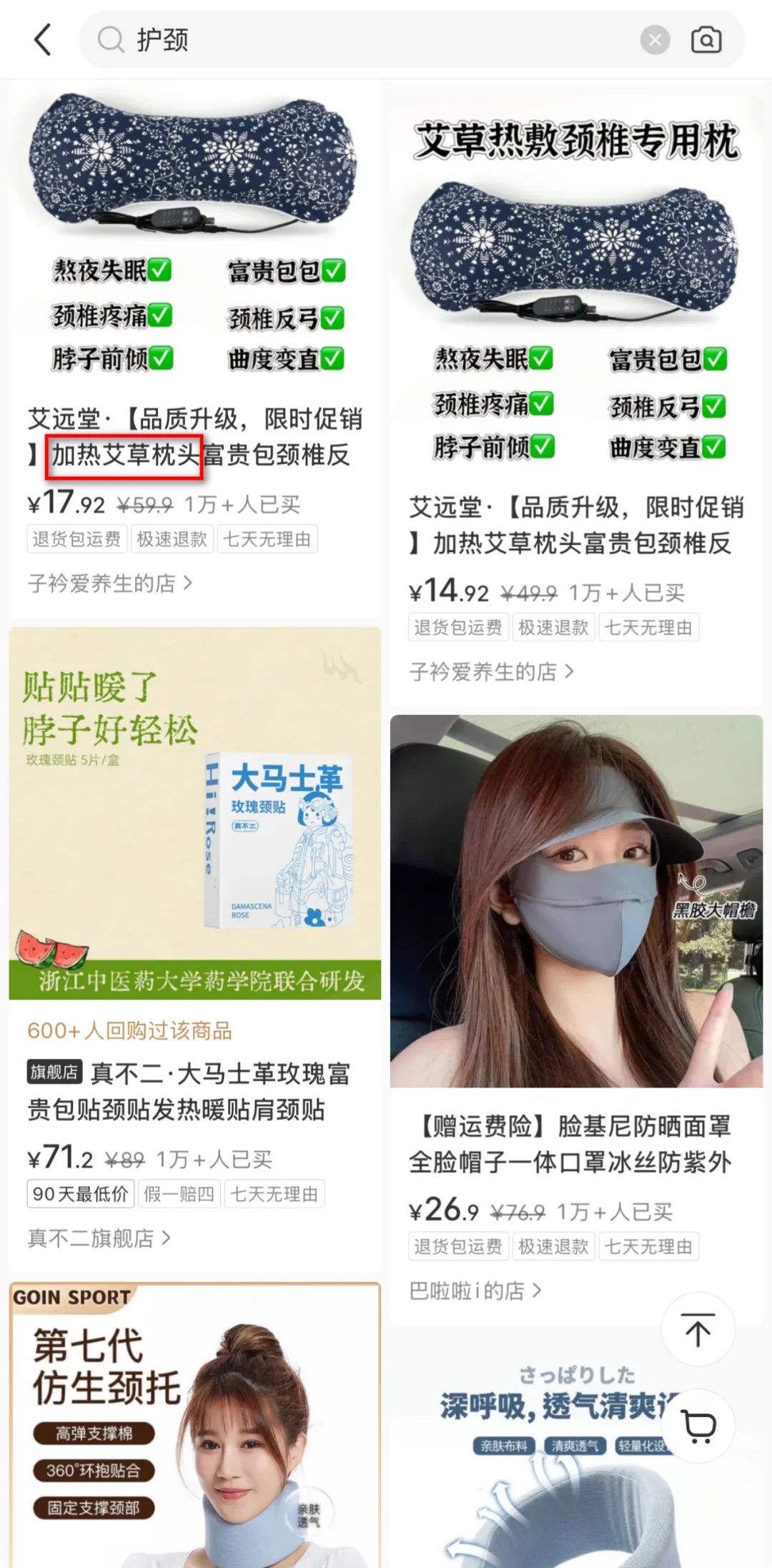 例如:搜索“护颈”,发现细分关键词“加热艾草枕头”