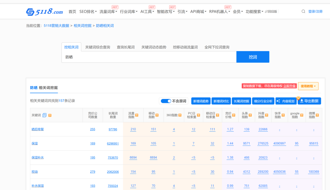 例如在百度搜索“防晒”,下拉展现的是“防晒霜哪个牌子好”、“防晒喷雾能带上飞机吗”,这是问题,不是关键词。