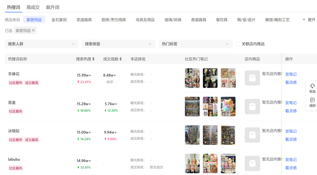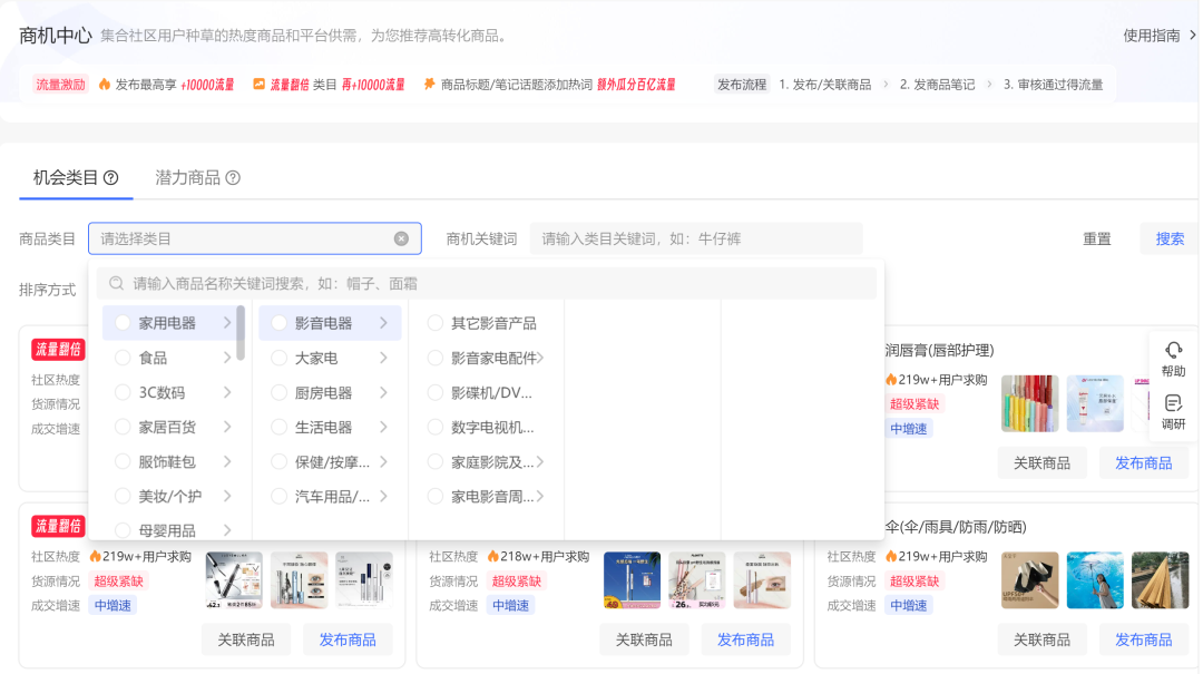 小红书的商机中心不但有小红书平台最全面的类目分类,还有基于大数据统计出来的近期的机会类目,也是一个很重要的选品渠道。