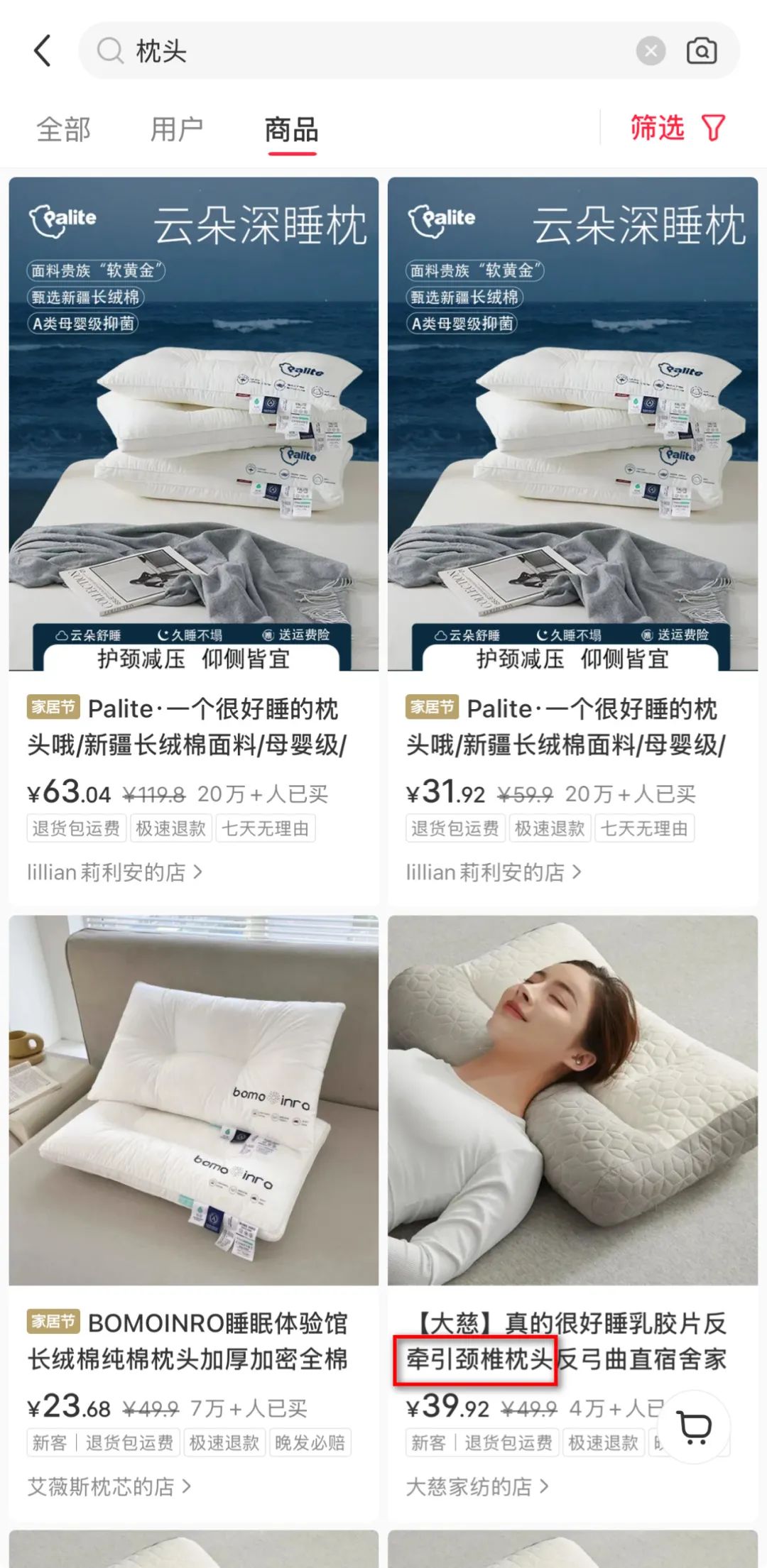 例如:搜索“枕头”,发现细分关键词“反牵引颈椎枕头”