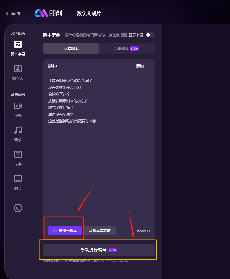需要点击如图一左下角的手动拆行编辑,如果手动编辑没亮就先点击帮我写脚本,再点击手动拆行编辑就可以了。