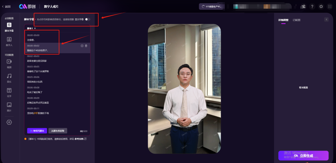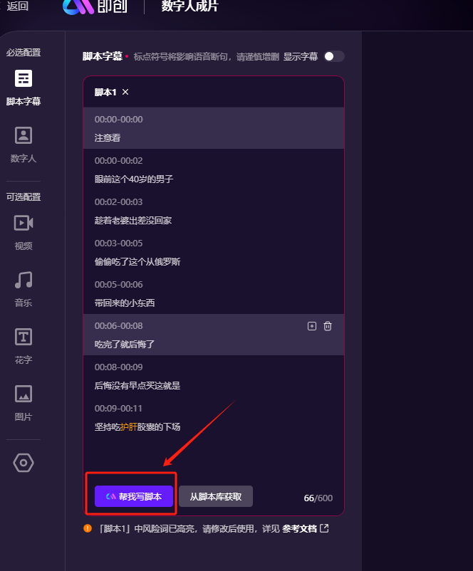 我之前就是走到这一步,没加逗号,还是生成机关枪讲话一样的数字人(建议提前在文案里快速加好标点符号断句,这样效率更高,在即创里加断句很卡很慢,费时费力)字幕根据自己习惯可加可不加,我一般都不加的。