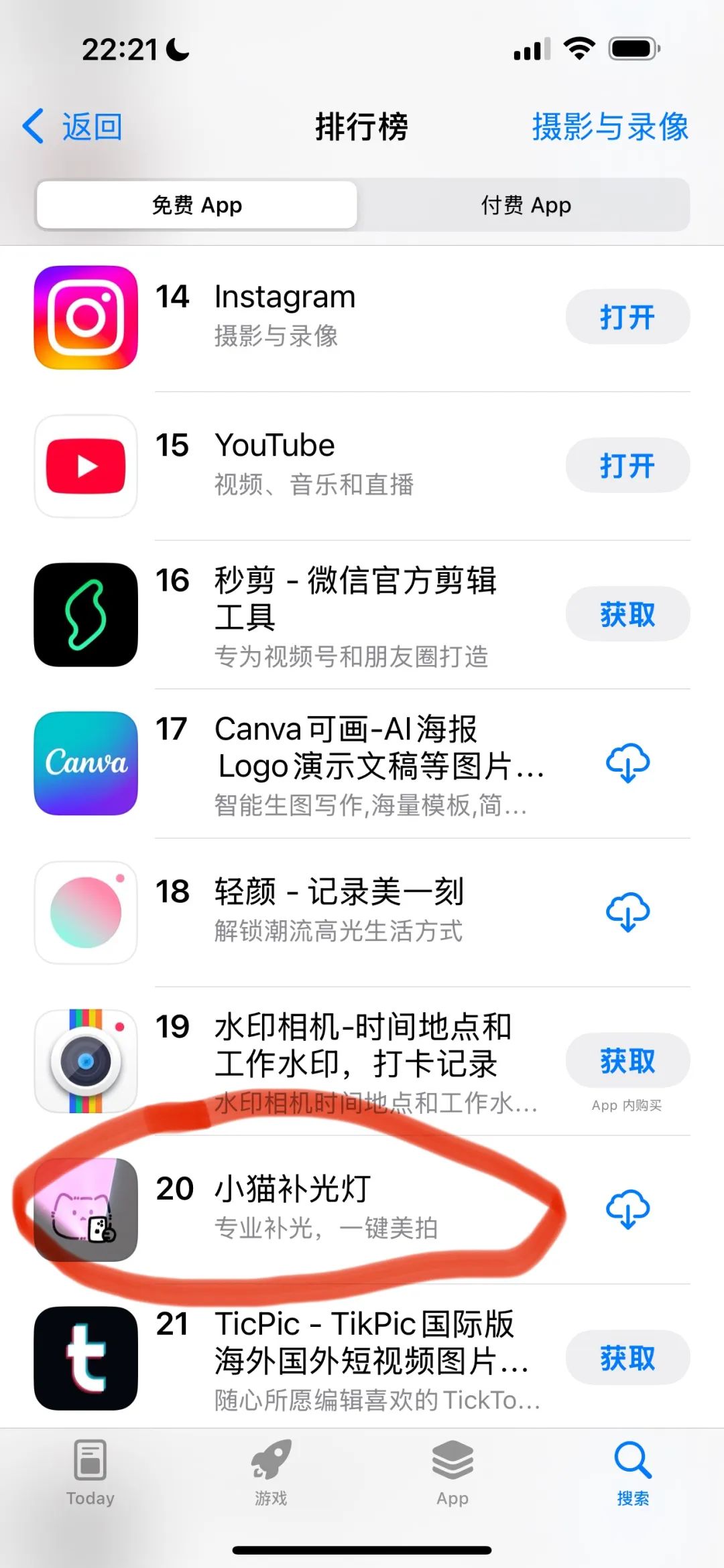 「小猫补光灯」在最高时甚至上到了AppStore分类排行榜的第20名,当是排在它前面几位的应用分别是YouTube、Instagram、Canva等。