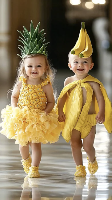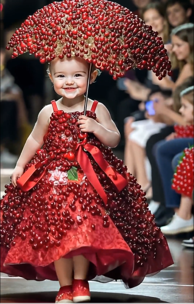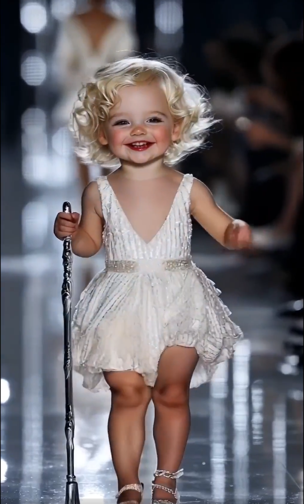 在附图中,小男孩和女孩在巴黎时装秀上,他们牵手一起走秀,非常开心。