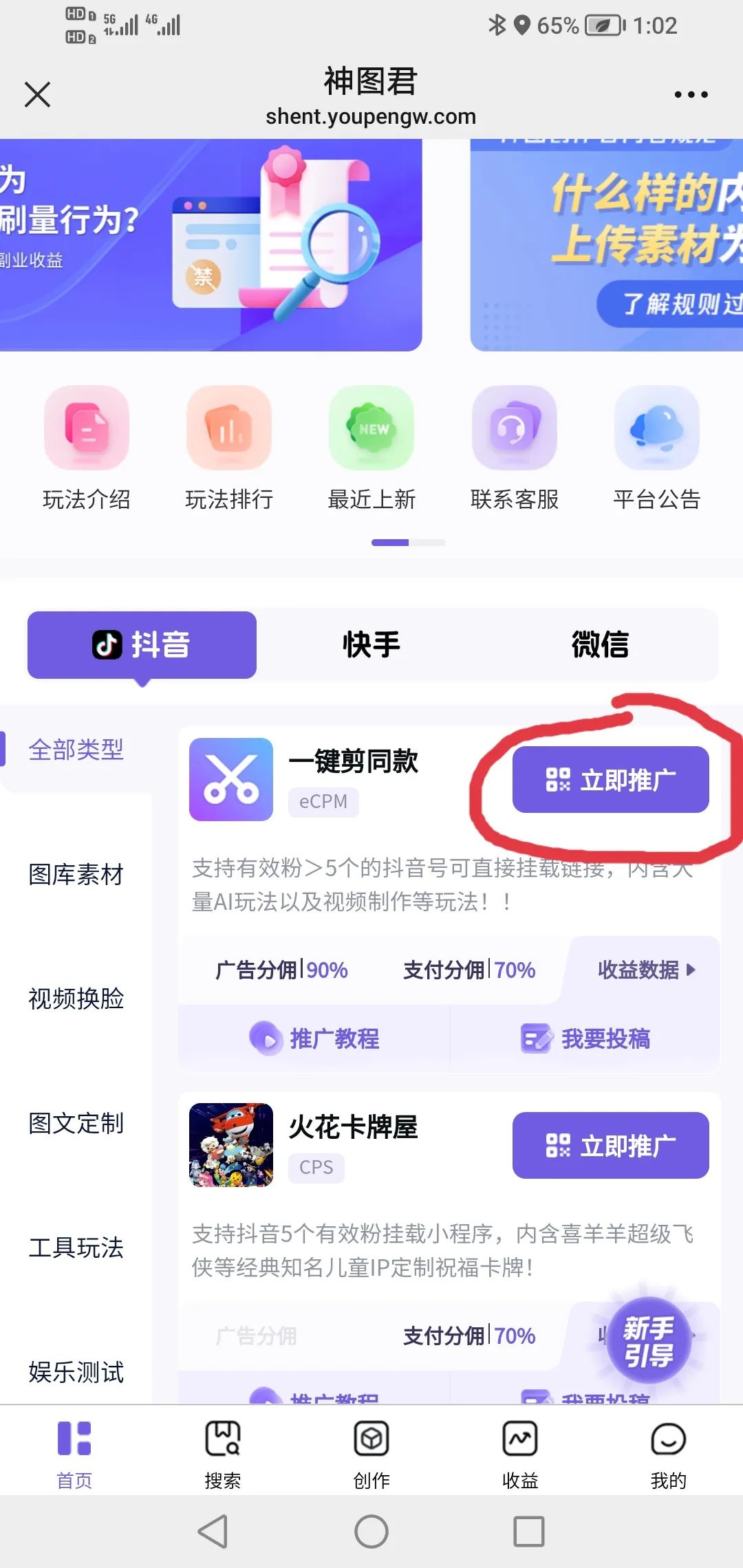 首先,打开神图小程序的后台,在首页中找到 “一键剪同款” 选项,然后点击 “立即推广”,这时会出现一个码,将其保存好,再用抖音进行绑定就可以了。