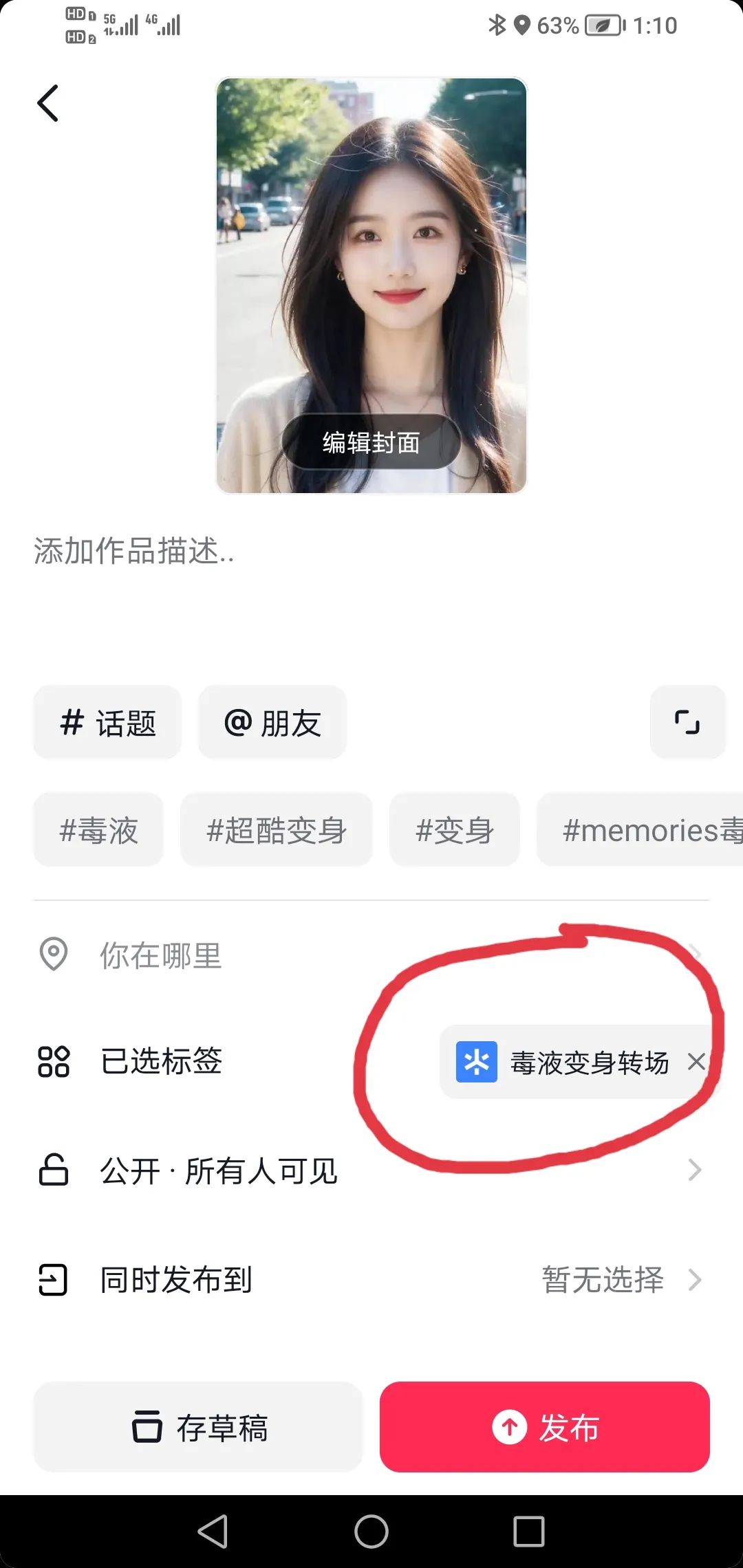 最后把制作好的视频导出来并分享到抖音,同时要配上合适的文案。这里需要注意一点,视频中一定要有毒液变身转场这个小程序图标,否则即便发布了也不会有收益!