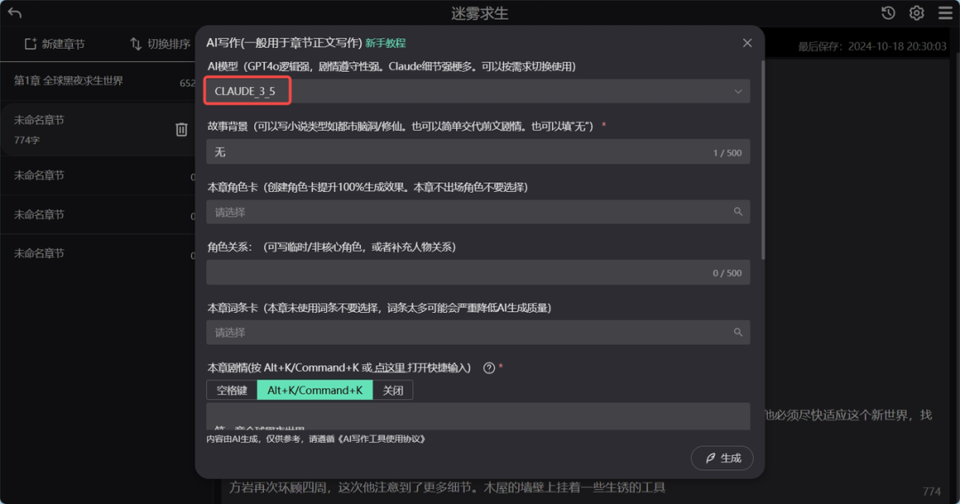 现在标题简介和封面已经全部解决了,就该用AI写小说的内容了。