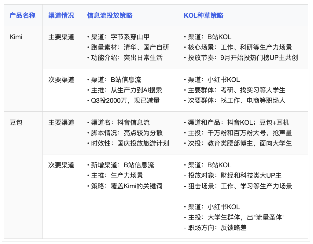 从KOL种草渠道来看,豆包率先拿下了多个千万粉和百万粉的抖音大号;Kimi也开始密集合作 B 站热门榜里的UP,合作完的作品也有多部继续上过热门。