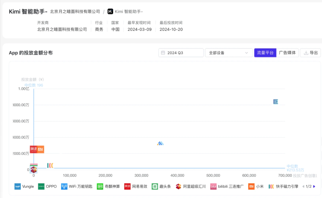 比如排名第一的月之暗面,10月投放金额之大,已经超过后4家之和。一位接过 kimi 家广告的AI自媒体透漏,文章发出后半小时内,就能收到款项。